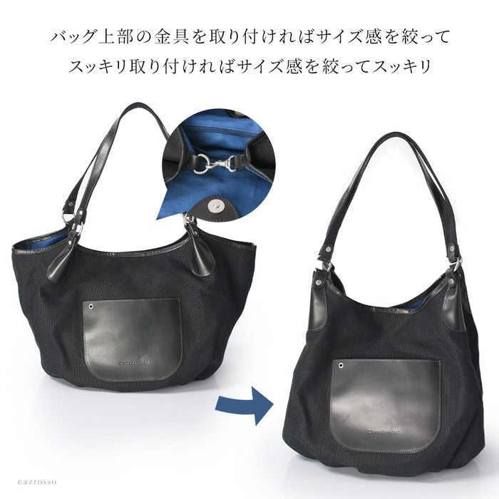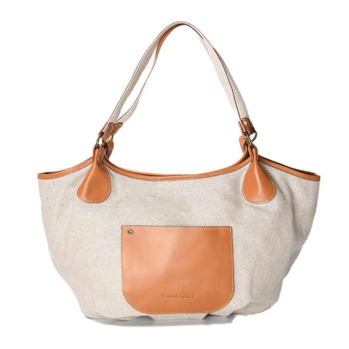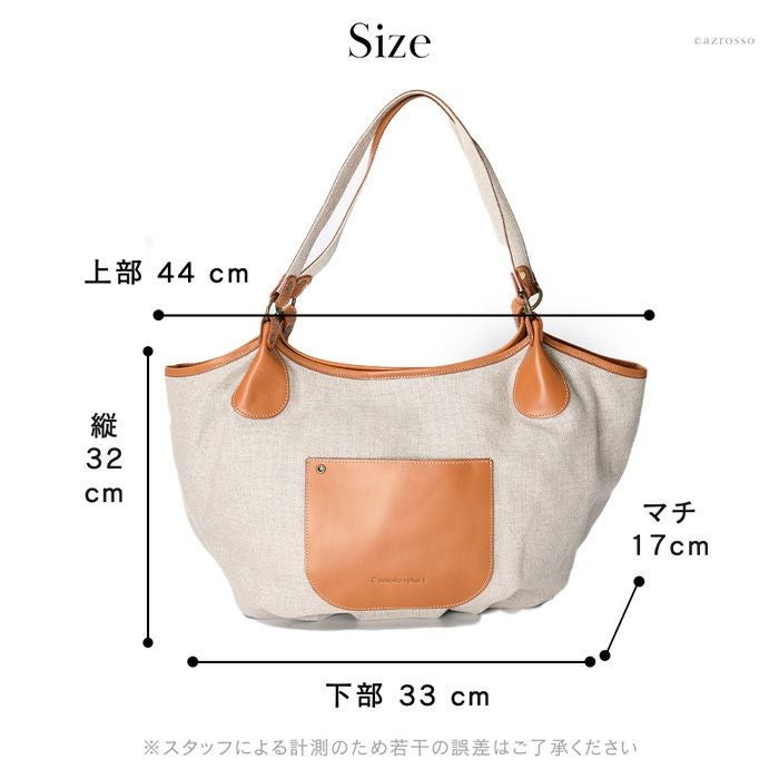 長めハンドルで持ちやすいキャンバストートバッグ。柔らかいリネン帆布×牛革のカジュアルになりすぎないデザイン。マチ広大容量でマザーズバッグにもオススメ。両サイドの金具を留めるとスリムになる2way 2way キャンバス トートバッグ リネン 帆布 A4 大きめ 大容量 レザー 本革 ブラック キャメル ベージュ 日本製 ブランド コモドプラスト C'omodo+plust バートン