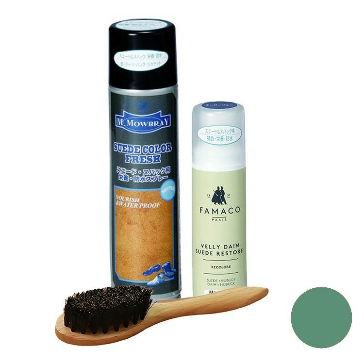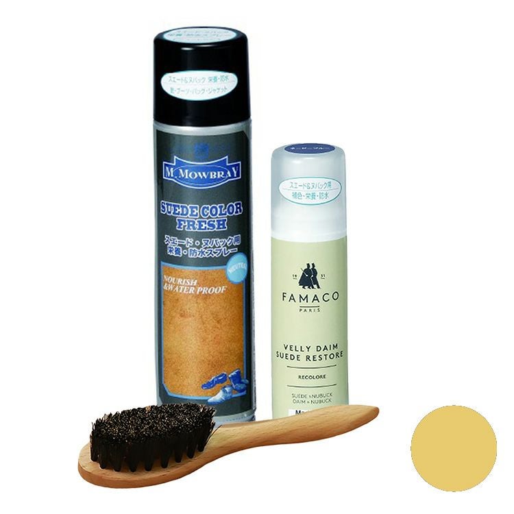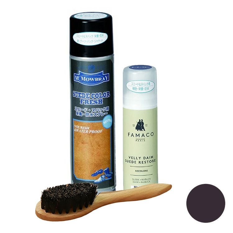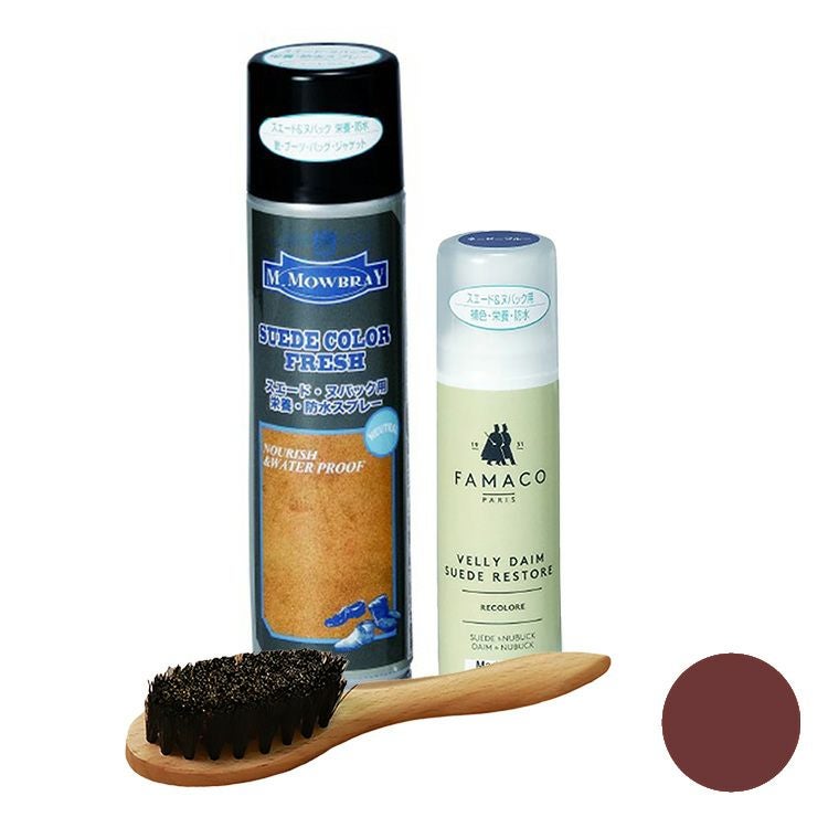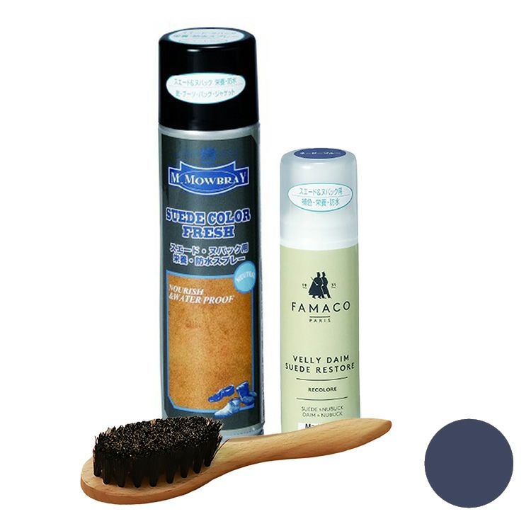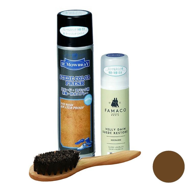 ヨーロッパで人気のシューケアブランド、M.MOWBRAYとFAMACO(ファマコ)の簡単スエード補色セット。スエードカラーダイムリキッドとスエードカラーフレッシュ、ワイヤーブラシで革本来の色と柔らかさを取り戻します ムートン ブーツ 補色液 スエードカラー ダイム リキッド ワイヤーブラシ FAMACO スエード・ヌバック用 スエードカラーフレッシュ M.MOWBRAY 革靴 ヌバック スエード 補色 スプレー 汚れ落とし 防水 栄養 保革