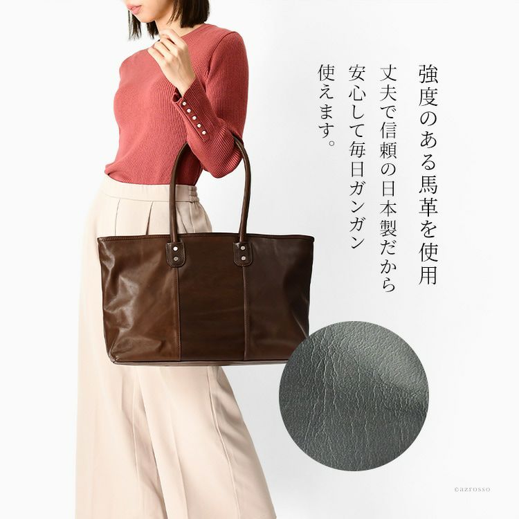 大容量で収納上手な日本製のレディーストート。味のある馬革をふんだんに使ったB4サイズ対応で通勤や旅行に最適、豊岡の鞄ブランドが作った日本製のビジネストートです。 日本製 本革 レディース トートバッグ 大きめ 大容量 ビジネス B4 A4対応 ブラック グレー ブラウン 馬革 服部 旅行 カジュアル あおりポケット