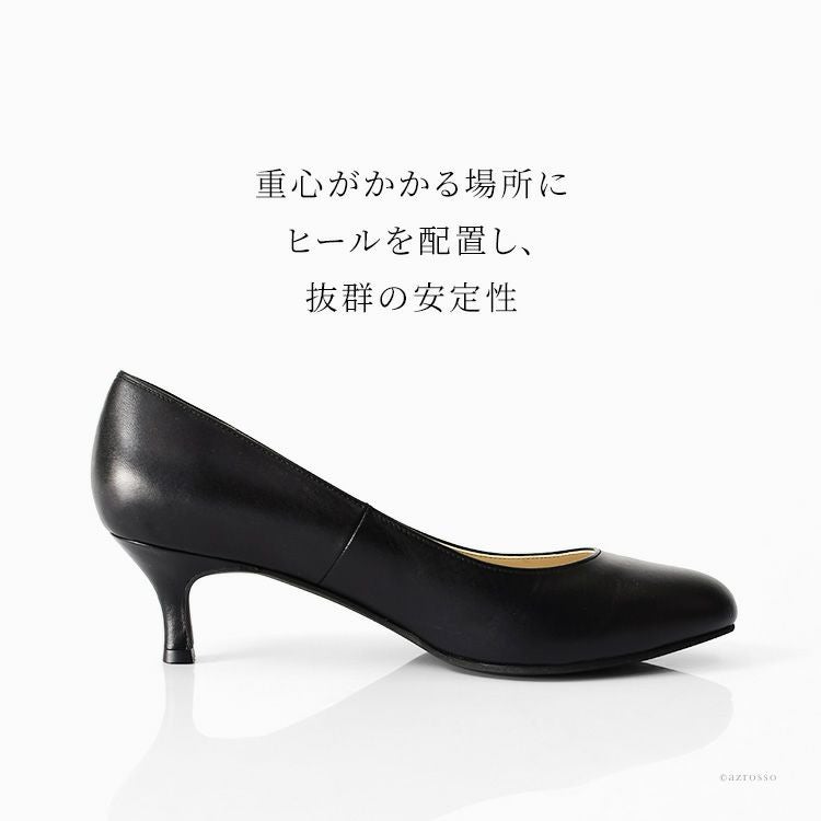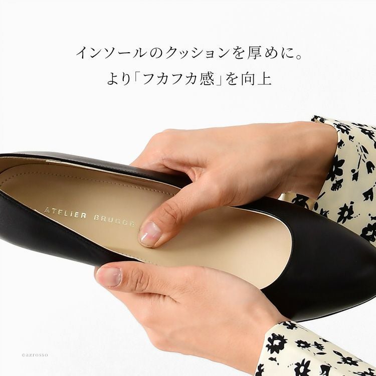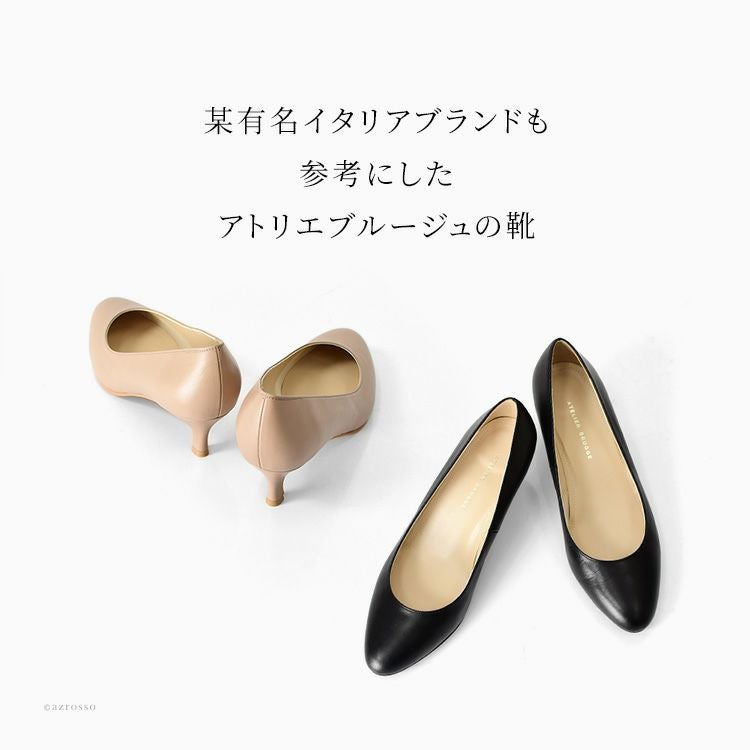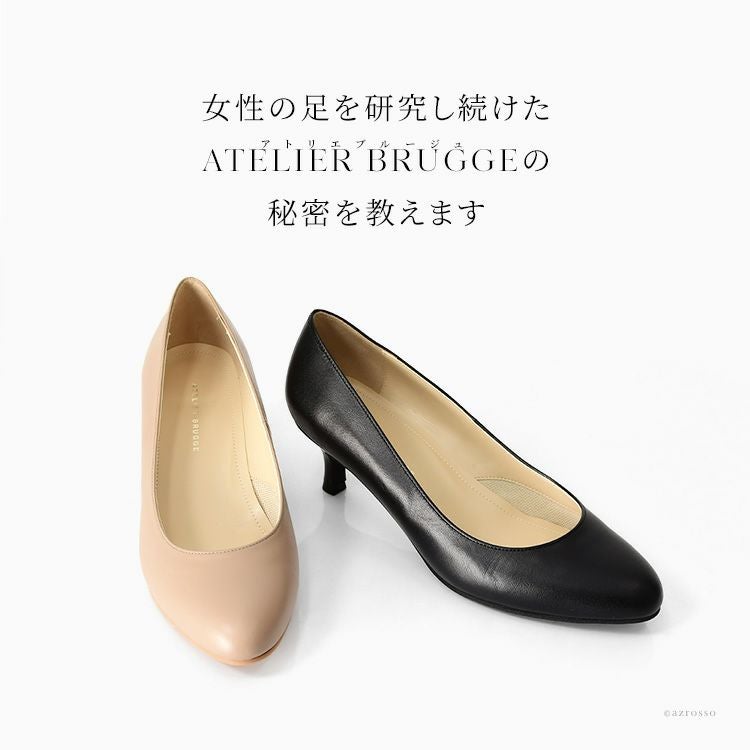 足へ負担をかけたくない女性におすすめレディースパンプス。5センチのキトゥンヒールが歩きやすい。汎用性高いラウンドトゥは入学式、卒業式などのセレモニーやフォーマル、ブラックフォーマル、お受験パンプスにも 日本製 パンプス 本革 ラウンドトゥ ヒール 5cm アトリエブルージュ 中敷き ふかふかクッション Atelier brugge 入学式 卒業式 ブラック フォーマル 冠婚葬祭