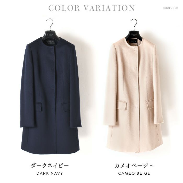 イタリアが誇るアウターブランドHeresis(エレシス)のバージンウール仕立てのノーカラーコート。スタンダードなショート丈。セミフォーマル(入学式 卒業式 お受験)に着用できるきれいめシルエット ヴァージンウール コート ノーカラーコート ミドル丈 ネイビー ベージュ レディース アウター ブランド Heresis エレシス