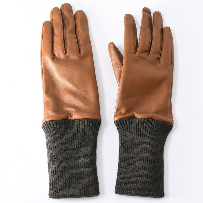 上品ナッパレザー×柔らかカシミヤ100%ニット手袋。手首までしっかり覆うミドル丈(セミロング丈)で冷たい風を寄せ付けない。手のひらにはスマホ対応本革を使用しタッチパネル操作も可能 レザー × カシミヤ ニット 手袋 スマホ対応 イタリア製 レディース ブランド GALA GLOVES ガラ グローブ ブラック ブラウン ベージュ