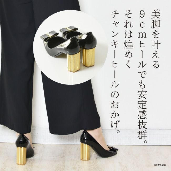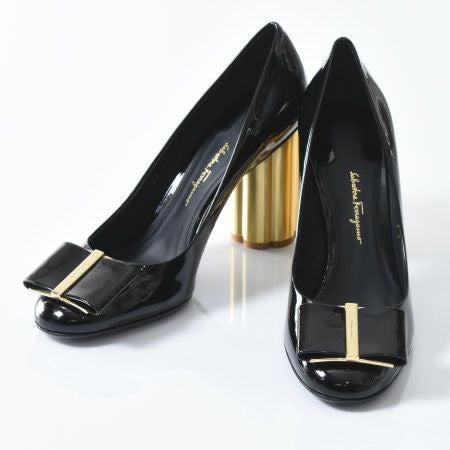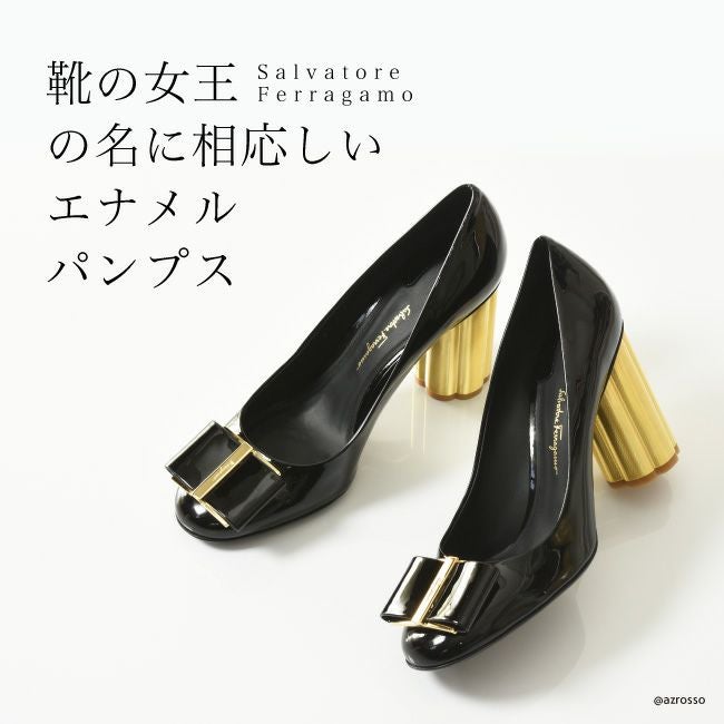 ※特価の為返品・キャンセル・交換無料サービス対応不可。※交換対応は、通常販売時のお買い物通りのご案内です。※サイズ交換希望で、ご交換希望サイズが欠品の場合は返品不可 22.5cm-25.5cm│フェラガモ パンプス レディース CAPUA 9cm ゴールド チャンキーヒール エナメル Salvatore Ferragamo 正規品