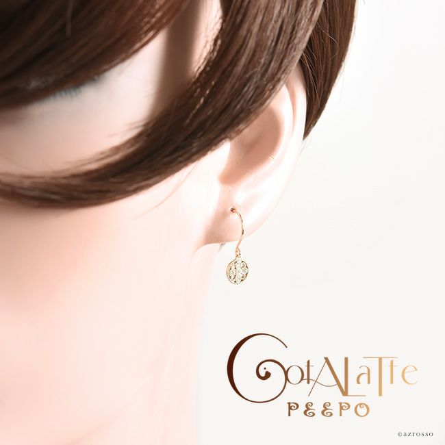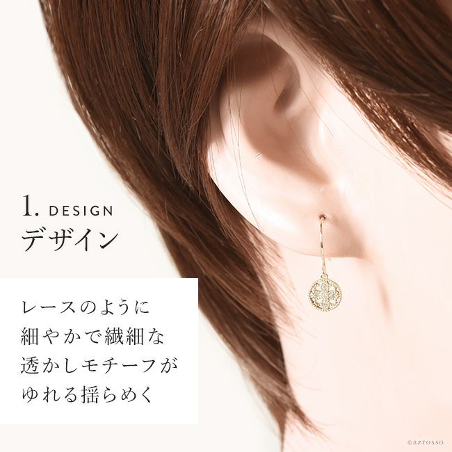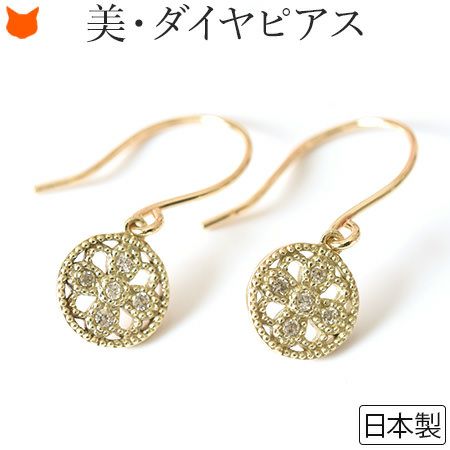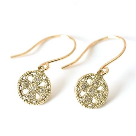 耳元で揺れる華奢な5つのダイヤモンドとゴールド。普段使いにもダイヤを。日本の一流職人の手から/ ダイヤ ゴールド ピアス サークル シンプル フックピアス 透かし 模様 レース風 コタラッテピーポー 日本製 4月 誕生石 プレゼント