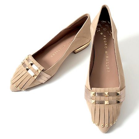スペイン発 人気ブランドPEDRO MIRALLES(ペドロミラーリェス)のフリンジ&スタッズのフラットシューズ。2cmぺたんこヒールで歩きやすい。きれいめポインテッドトゥのスエードレザーシューズ/ 23cm-24.5cm|スエード フラット シューズ レディース フリンジ レザー スタッズ パンプス 本革 ぺたんこ 靴 ポインテッド バレエシューズ ベージュ グレー 歩きやすい 大きい サイズ 25cm 25.5cm ペドロミラーリェス