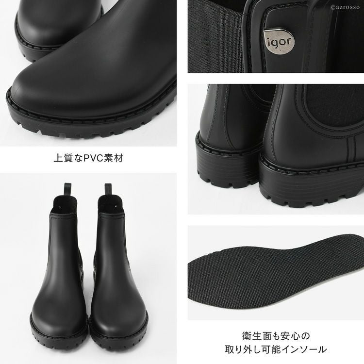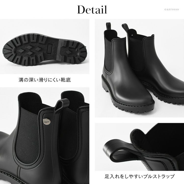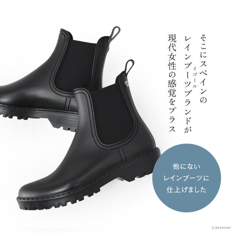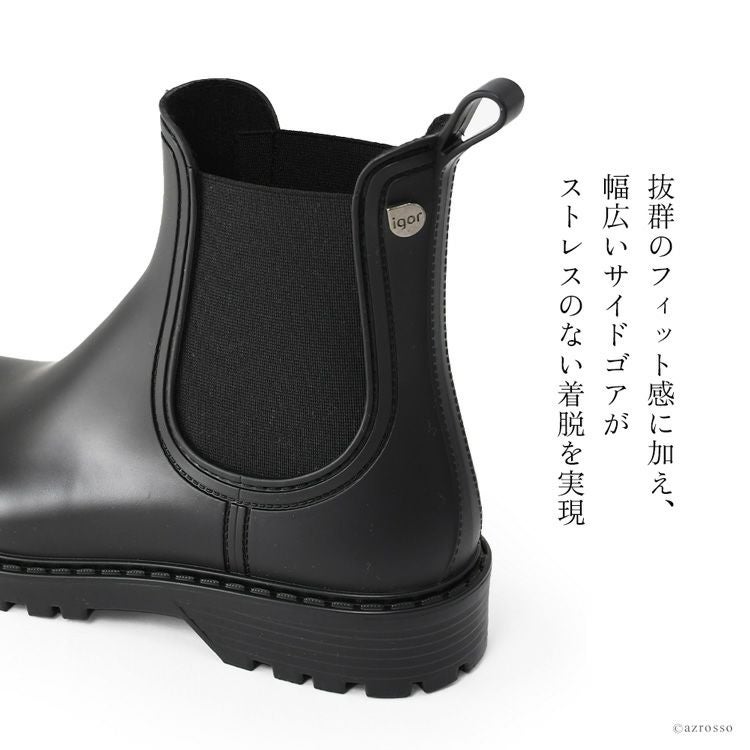 スタイリッシュなサイドゴアレインブーツがスペインブランドigorから登場。足首を細く華奢に見せる細身の履き口でも伸縮性抜群のゴアで脱ぎ履き楽々。普段履きから通勤まで晴雨兼用で履けるマットなショート長靴 スペイン製 サイドゴア レインブーツ レディース ショート丈 雨靴 おしゃれ 滑らない 長靴 黒 シンプル 歩きやすい 履きやすい ブランド igor
