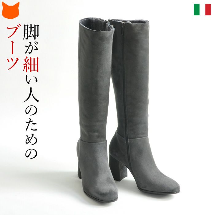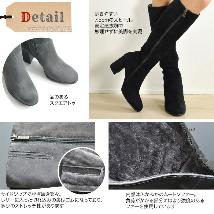 ※特価の為返品・キャンセル・交換無料サービス対応不可。※交換対応は、通常販売時のお買い物通りのご案内です。※サイズ交換希望で、ご交換希望サイズが欠品の場合は返品不可 ヒール7cm ロングブーツ スエード イタリア ブランド 内ボア リアルムートン 暖かい サイドジップファスナー 太ヒール チャンキーヒール 黒 ブラック グレー