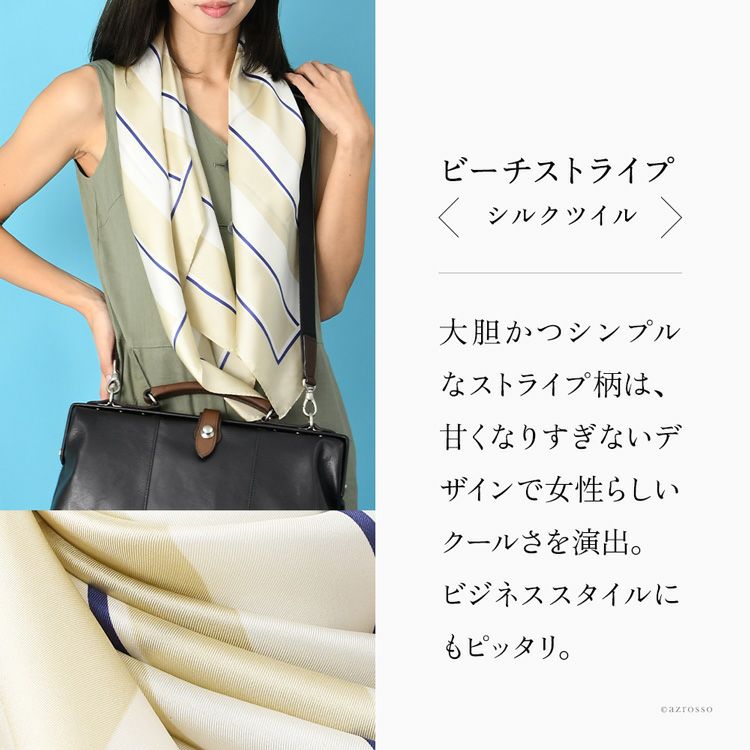 キヌフローレス 上質なシルク100%の日本製スカーフといえば横浜スカーフ。世界最高水準の手捺染(プリント)技術で製作。母の日 誕生日 記念日 お母さん 彼女 妻(奥さん)へのお祝いのプレゼントにおすすめ / ビーチストライプ ツイル シルクスカーフ ボーダー柄 88x88cm 日本製 大判 正方形 ブランド 春夏 ストライプ