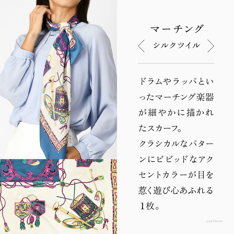 世界に誇る横浜スカーフブランドKINU flawless(キヌ フローレス)の楽器柄シルクスカーフ「マーチング」。誕生日 敬老の日ギフトにもおすすめの正方形スカーフ マーチング シルク ツイル 楽器柄 シルク100% 90cm×90cm 日本製 横浜スカーフ【通常ネコポス配送】