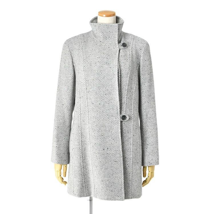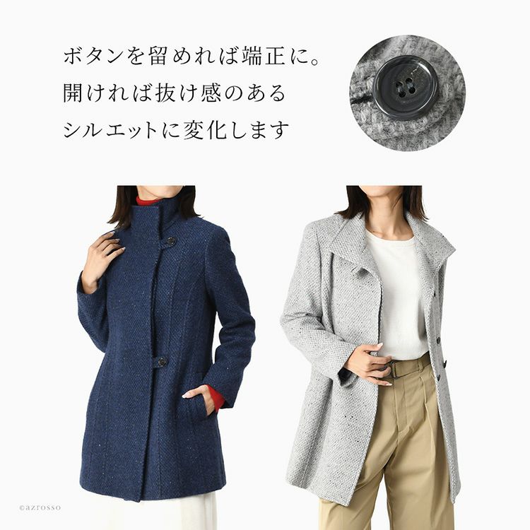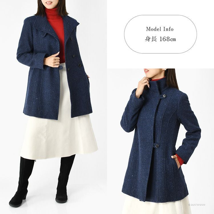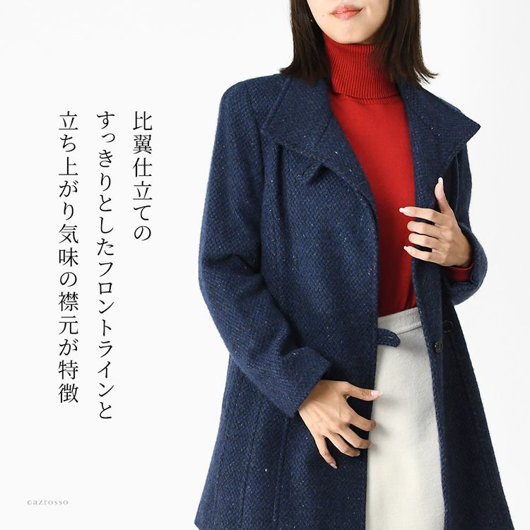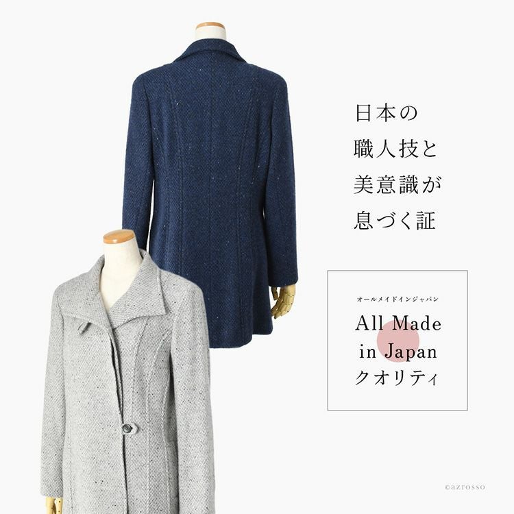 ビアセリカブランドの軽くて暖かいツイード調のカシミヤコート。高品質な国産仕上げ。ビジネス、フォーマル、セレモニー、普段使いに活躍。40代・50代からシニアのおしゃれな女性に知的で洗練された装いを与えます。 日本製 カシミヤ100%コート レディース ステンカラーコート ツイード調 ミドル丈 軽い 暖かい 冬 フォーマル ブランド スタンドカラー