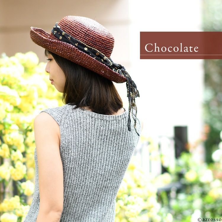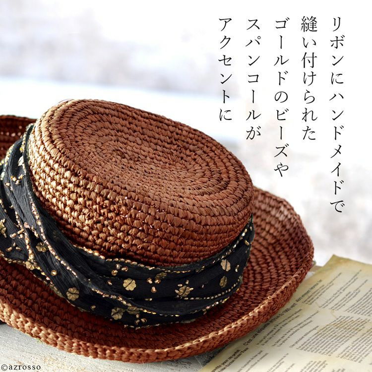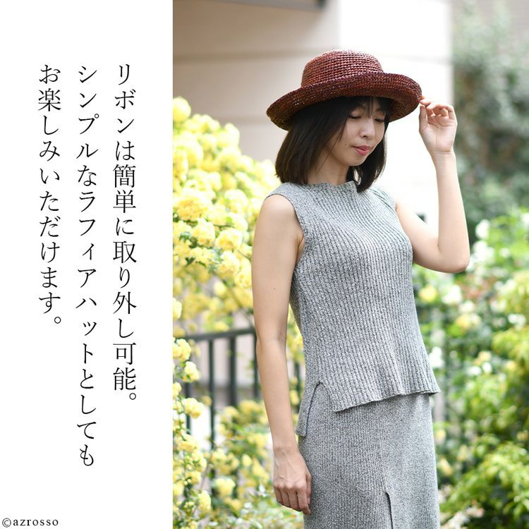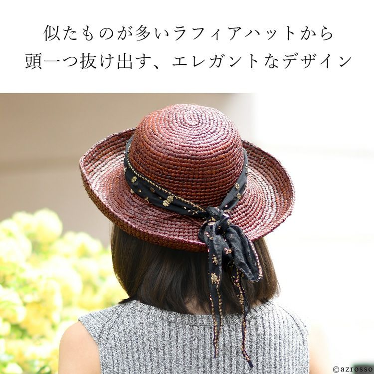 涼し気なラフィアに煌めくシルクリボンをプラスしたエレガントなつば広帽子。おしゃれに日焼け対策&紫外線対策ができるUPF50+。リボンを取り外してシンプルなストローハットとしてもお楽しみいただけます つば広 リボン ラフィアハット 折りたたみ uvカット 麦わら帽子 ストローハット 大きいサイズ 56cm 蒸れない おしゃれ ブラウン レディース ブランド スカラ