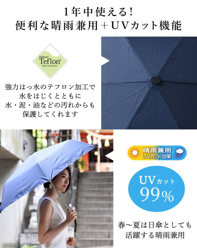 99%紫外線カット加工済み。春から夏にかけては、日傘としても活躍します。夏は突然の雨(スコール)が多いですから、日傘としても使える自動開閉傘はとても便利ですよね。