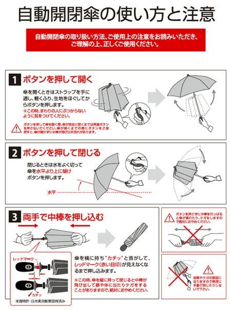 ボタンを押すだけですぐに閉まるから、建物に入ると同時に閉じることができて、自動的に骨が折りたたまれた状態にまで閉まるので、傘をポキポキ折り曲げる手間がいりません。普通の自動開閉傘と違い、閉じる時に3段の中棒が自動で2段に縮み、半分の長さまで収納されるので本当に便利です。