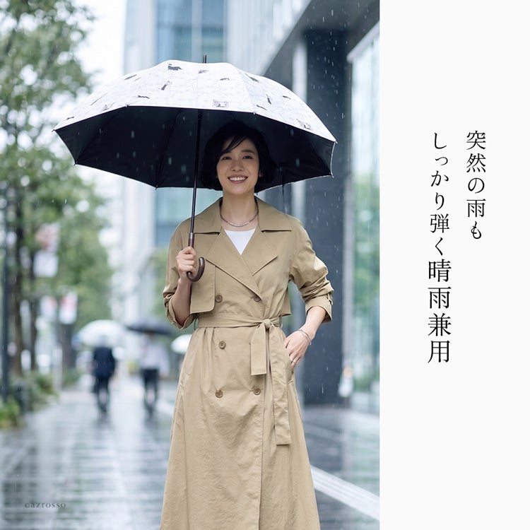 遊び心のある猫柄がユニークでエレガントな「ルビアレイン」の完全遮光・晴雨兼用長傘を差す大人の女性 詳細画像2 共通ブランド画像