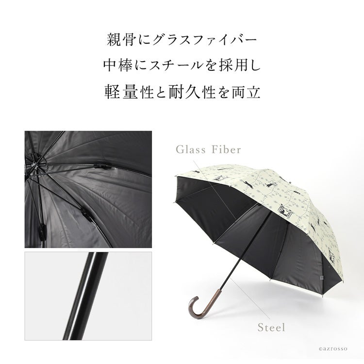 4. 完全遮光 晴雨兼用傘 手開き 長傘 小さめ 猫 柄 総柄 レディース UVカット 100 遮熱 ブラックコーティング 裏黒 涼しい 50cm グラスファイバー 軽量
