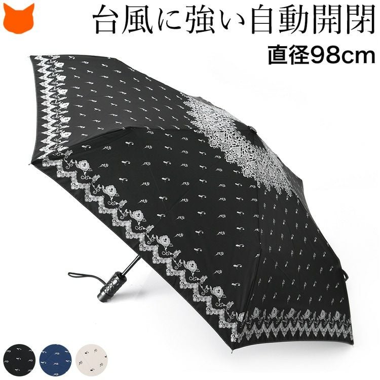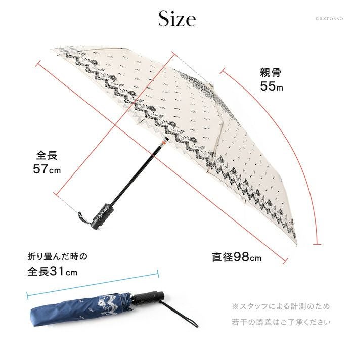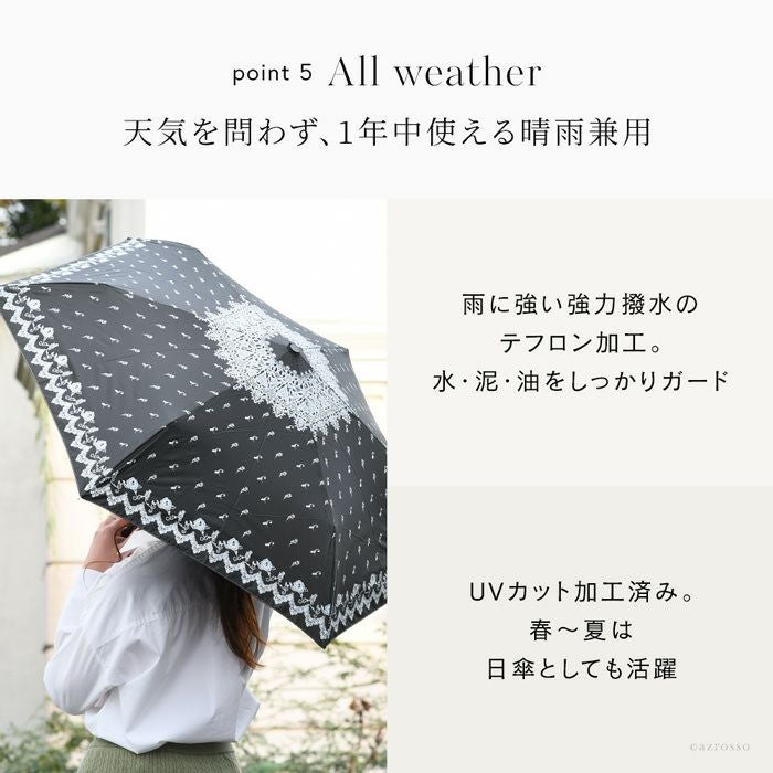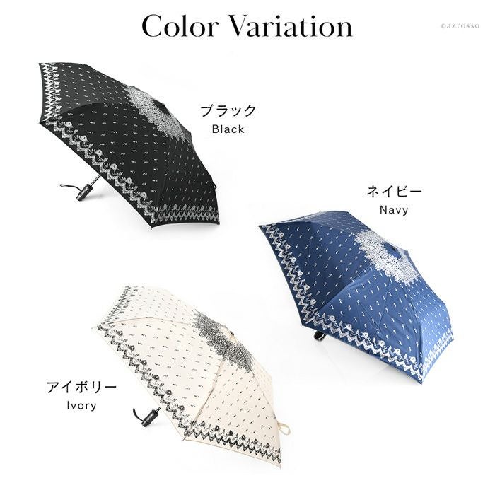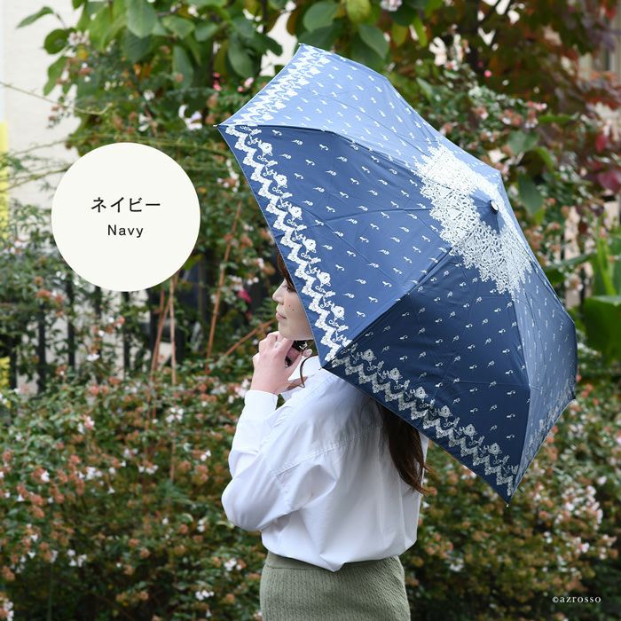 ブラック&アイボリーはレース柄、ネイビーは小花柄と落ち着いた色合いでありながら、非常に女性らしいエレガントな雰囲気が漂います。シンプルなコーデもこの傘を差せば凛とし表情に。晴雨兼用で、夏の暑い日差しも爽やかに遮ってくれます。