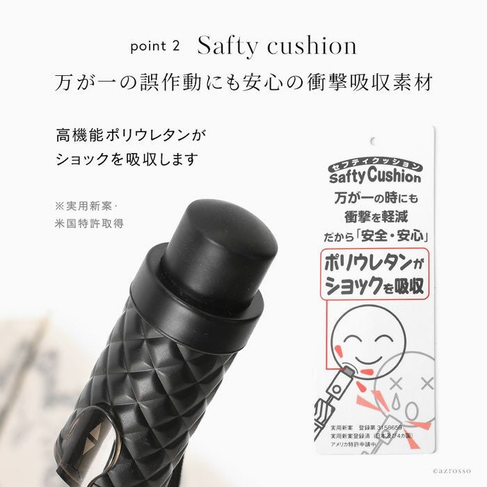 傘の持ち手は柔らかなポリウレタン加工になっており、ダイヤ柄のデザインも握りやすさを考えて作られています。また、閉じた時に中棒が自動で戻ってくるので、女性でも楽に収納できます。