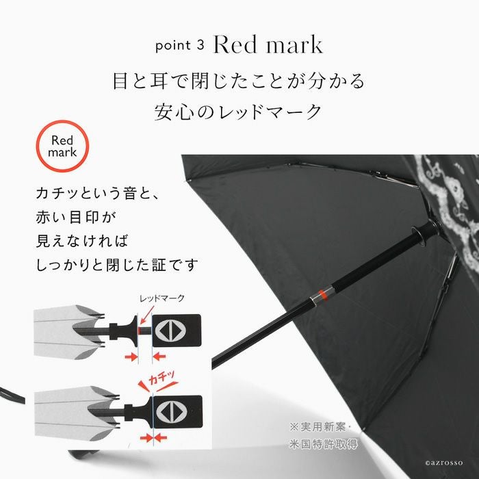 強風で傘がバーンとひっくり返ってしまっても、ボタン1つで元通りに。傘が完全に閉じるとカチッと音がすると同時に、赤い目印が隠れて「安心」を知らせてくれるレッドマーク付きです。