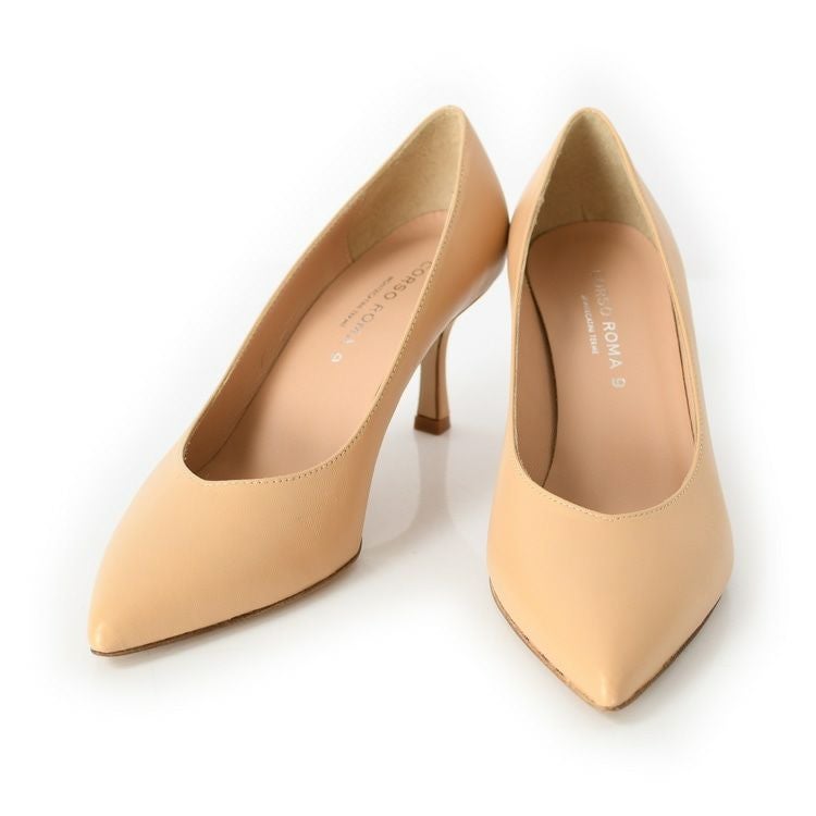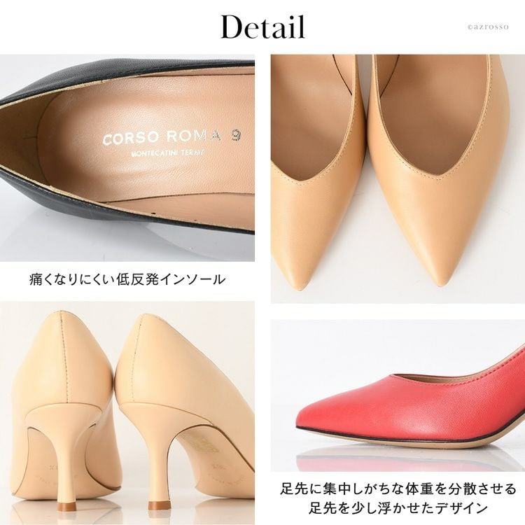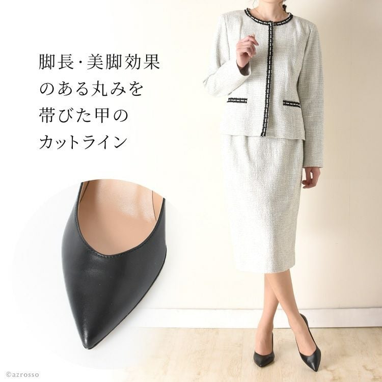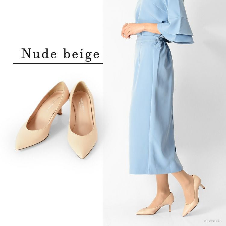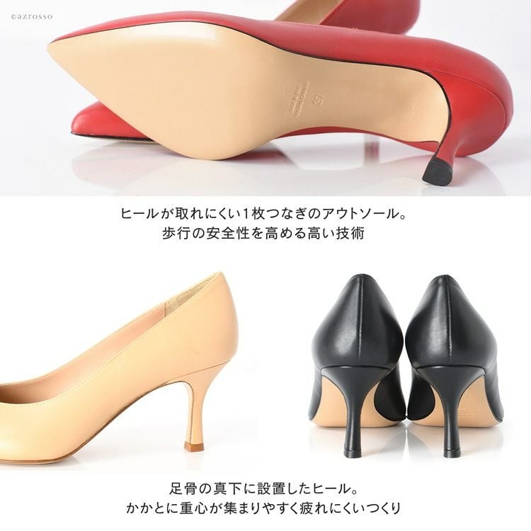 このパンプスの一番の特徴はなんといっても履き口の丸みを帯びた美しいVカット。安定感を損なわないラインで肌が見える部分を広げることで、脚長・美脚効果を演出します。