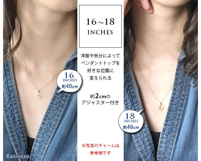 華奢なネックレスのチェーンは約40㎝~46㎝程で調節可能なデザイン。