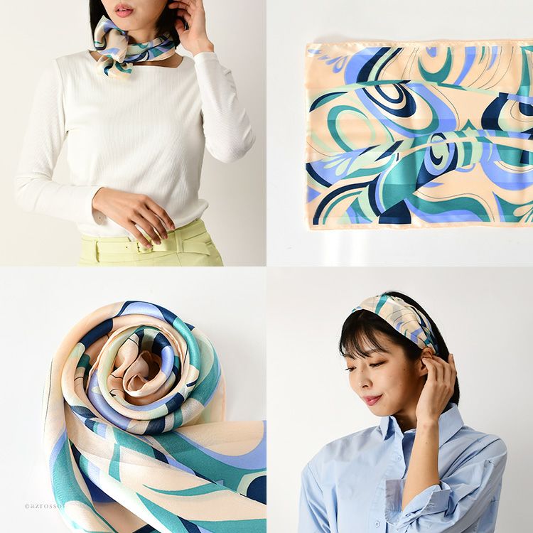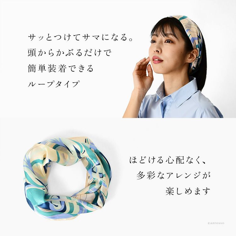 簡単装着できて、気になる首元をエレガントに隠してくれるループタイプのシルクスカーフです。