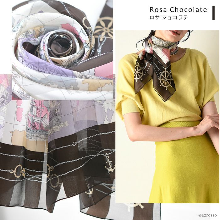 ロサショコラテ 1枚柄写真 ロサショコラテ モデル写真 テソログリーン 1枚柄写真 テソログリーン モデル写真 アヴェントラネイビー 1枚柄写真 アヴェントラネイビー モデル写真 スカーフのギフトラッピング