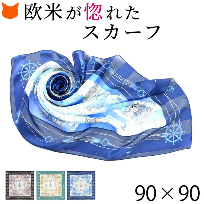 世界トップレベルの技法で紡ぐ横浜スカーフ シルク100の上質スカーフは誕生日プレゼントやお祝いギフトにもおすすめ 横浜スカーフ ユーラシア 90cm シルクサテンストライプ 日本製 正方形 人気の航海図