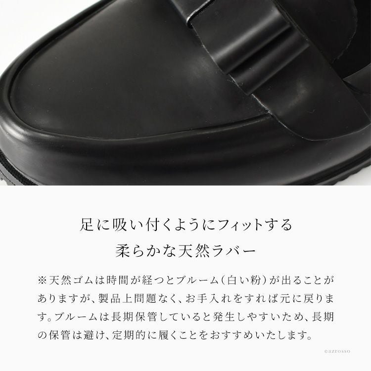・天然ゴムは時間が経つとブルーム(白い粉)が出ることがありますが、製品上問題なく、お手入れをすれば元に戻ります。ブルームは長期保管していると発生しやすいため、長期の保管は避け、定期的に履くことをおすすめいたします。