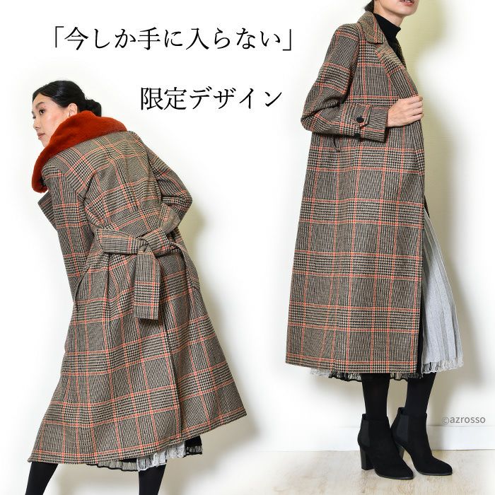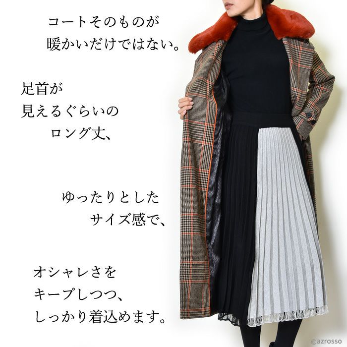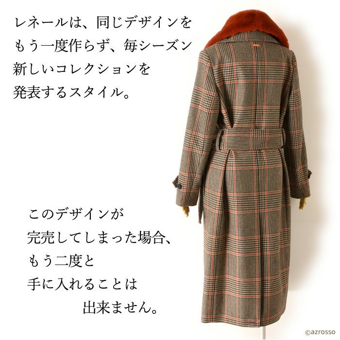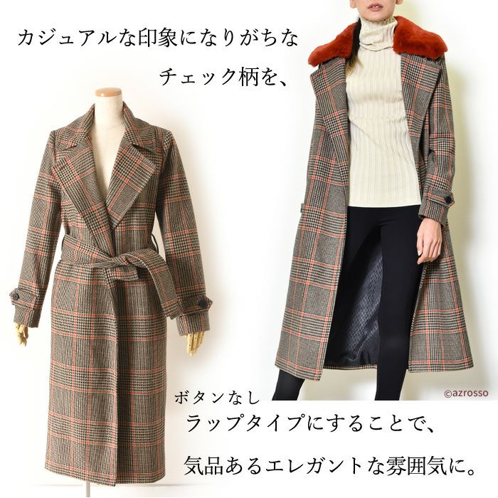 チェック柄 ラップコート ウール ロングコート レディース リバーコート ガウンコート フランス製 ブランド MAISON LENER メゾン レネール エコファー付き