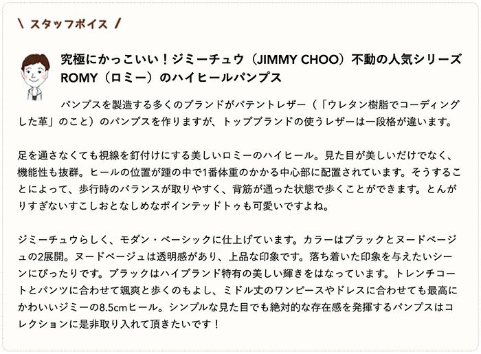 多くのセレブリティーを虜にする現代のシンデレラブランドJIMMY CHOO。ROMY(ロミー)は、ジミーチュウの十八番ともいえるポインテッドトゥに、8.5cmのピンヒールでスパイシーな印象に仕上げた魅惑の1足。