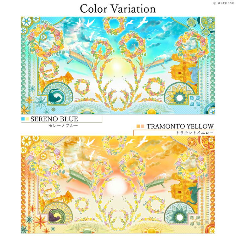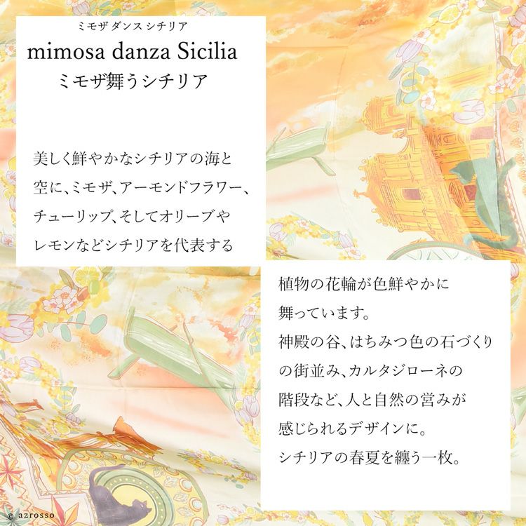 ミモザ舞うシチリア 超大判ストール 100×200 シルク レクセル 日本製 ベージュ ブルー オレンジ 冷房対策や紫外線対策に重宝