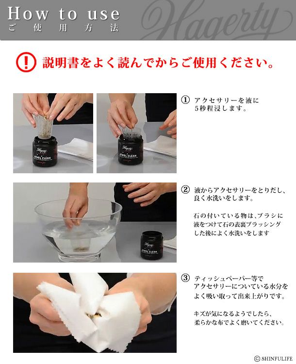 (金製品、プラチナ、ダイアモンド、ルビー、サファイア等にはHagerty ジュエルクリーンを御使用下さい)