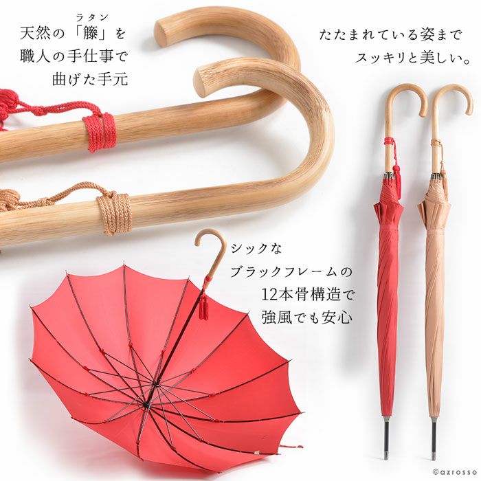 シンプルなシルエットに、高級感のあるラタンの手元と、安心感のある12本骨のWAKAO(ワカオ)の傘をご紹介します。