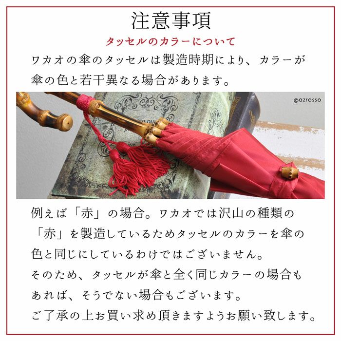 ワカオの傘のタッセルは、製造時期によりカラーが傘の色と若干異なる場合があります。