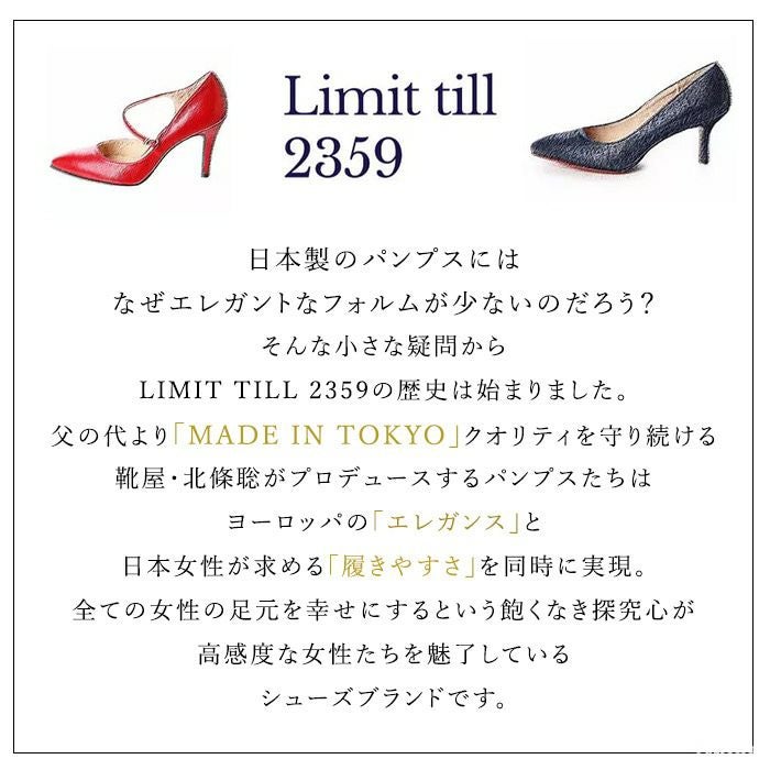 そんな小さな疑問からLIMIT TILL 2359の歴史は始まりました。父の代より「MADE IN TOKYO」クオリティを守り続ける靴屋・北條聡がプロデュースするパンプスたちは、イタリア靴の「エレガンス」と日本女性が求める「履きやすさ」を同時に実現。全ての女性の足元を幸せにするという飽くなき探究心が高感度な女性たちを魅了しているシューズブランドです。