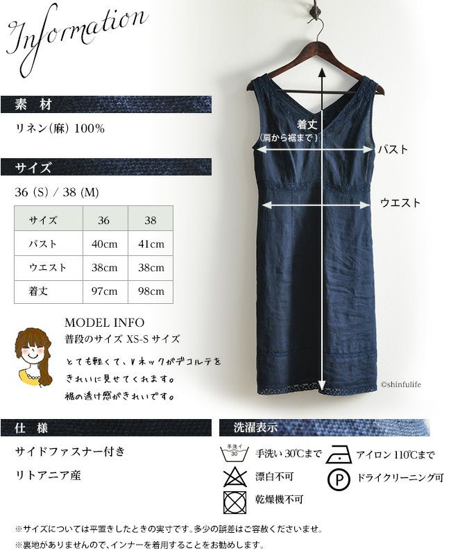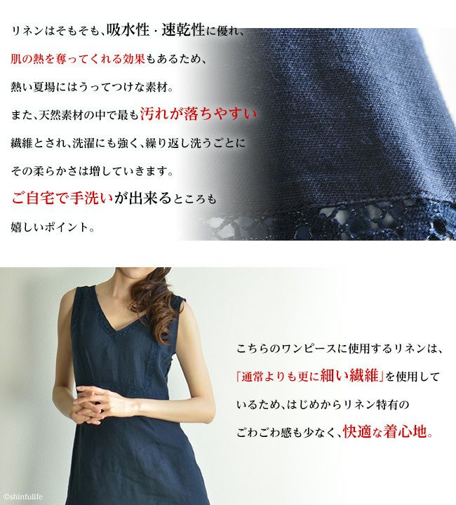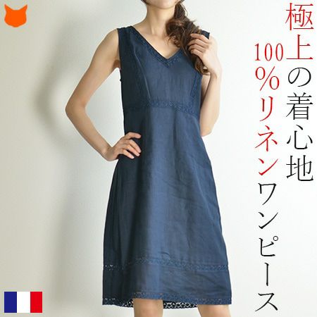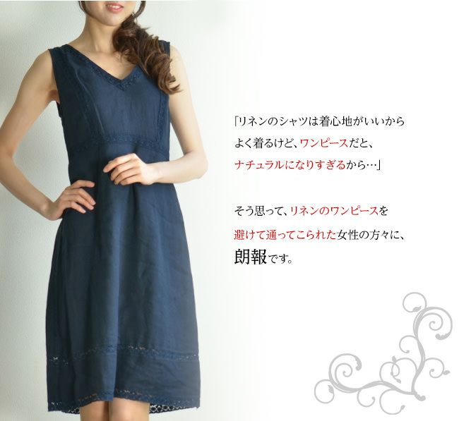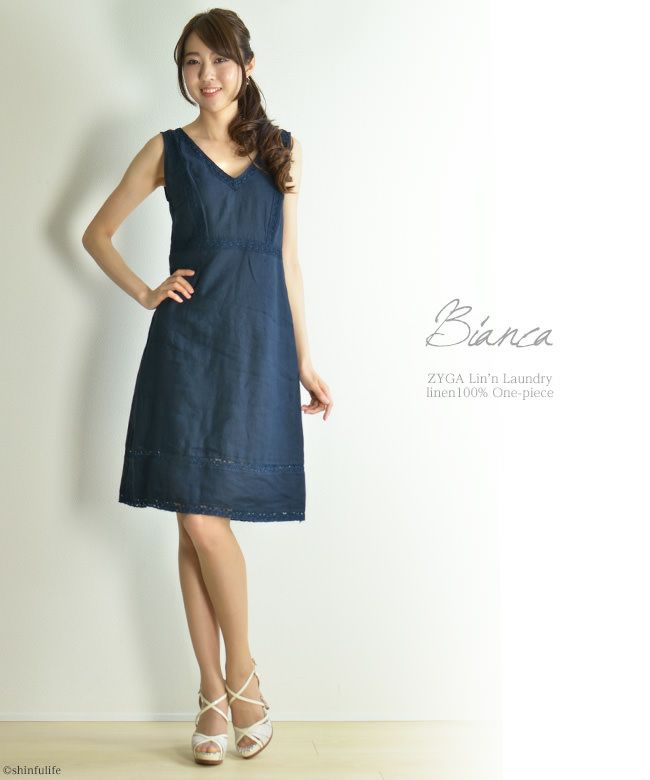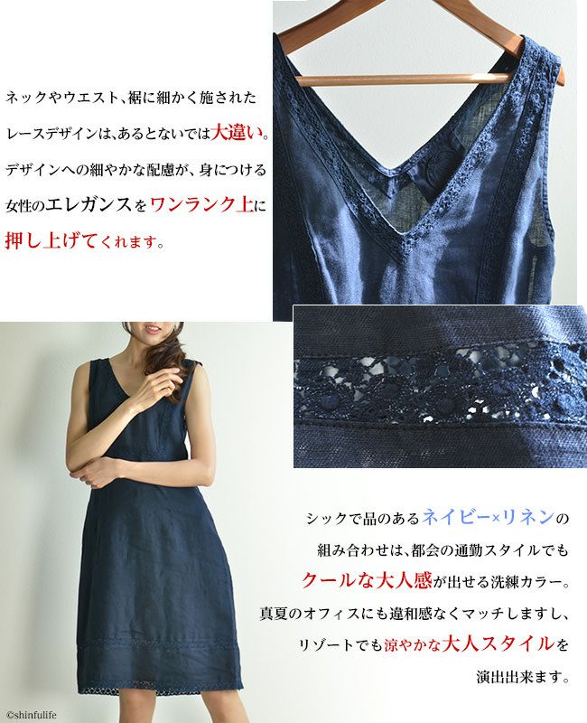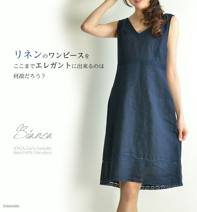 リネン ワンピース 春夏 ノースリーブ ZYGA レディース Aライン 上品 レース 麻 ナチュラル ネイビー ジガ ズィガ zyg1605rbian