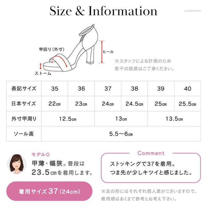 コメント:ストッキングで37を着用。つま先が少しキツイと感じました。