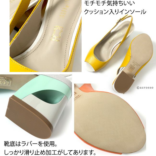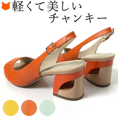 インソールもクッション入りで、6cm、6.5cmのハイヒールでも、足の裏の疲れ、痛みを抑えてくれる、カラフルなチャンキーヒールサンダルです。