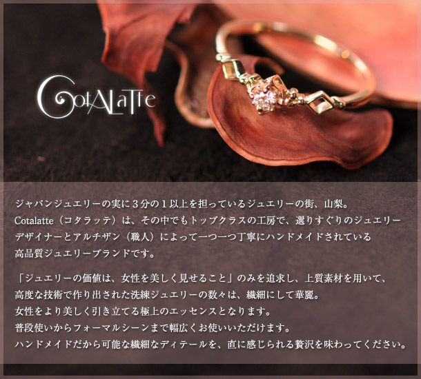 ジャパンジュエリーの実に3分の1以上を担っているジュエリーの街、山梨。Cotalatte Peepo(コタラッテ ピーポー)は、その中でもトップクラスの工房で、選りすぐりのジュエリーデザイナーとアルチザン(職人)によって一つ一つ丁寧にハンドメイドされている高品質ジュエリーブランドです。