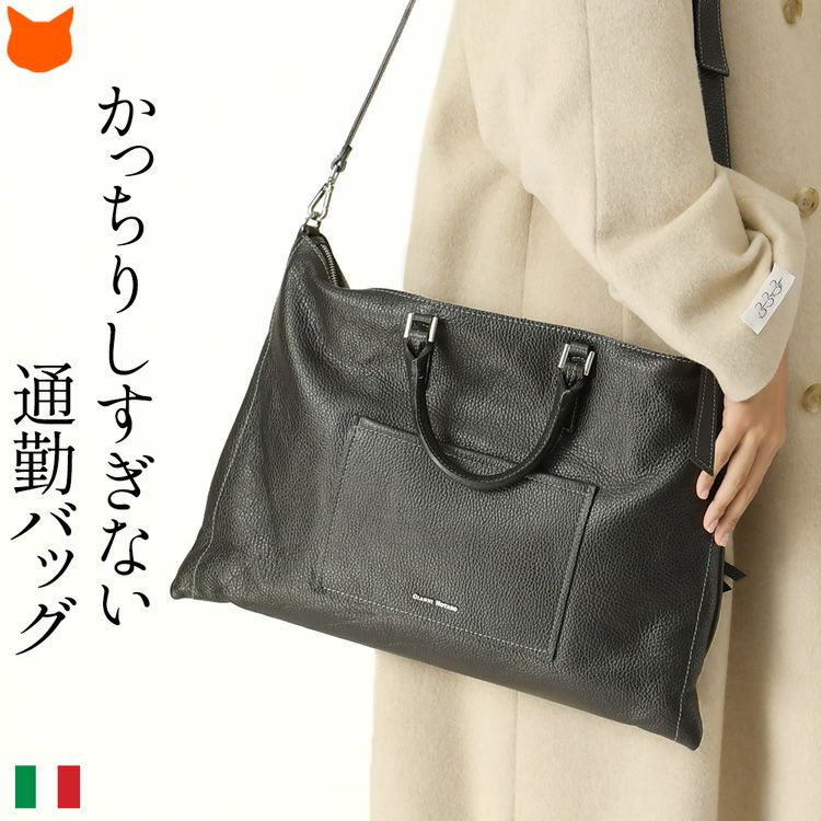 通勤バッグ オフィス ビジネスバッグ A4 2way ハンドバッグ 肩掛け ショルダーバッグ 本革 イタリア製 レザー 黒 ブラック 薄マチ