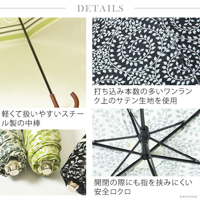 柔らかな色合いのリーフ柄がおしゃれな晴雨兼用傘。遮光100・UVカット100・遮熱効果ありで凉しい大判日傘。クールな大人女性の為の雨傘ブランド Lluvia rain (ルビアレイン) 完全遮光 日傘 晴雨兼用 長傘 UVカット ブラックコーティング 遮熱 涼しい レディース 大判 58cm ワンタッチジャンプ傘 グローブ