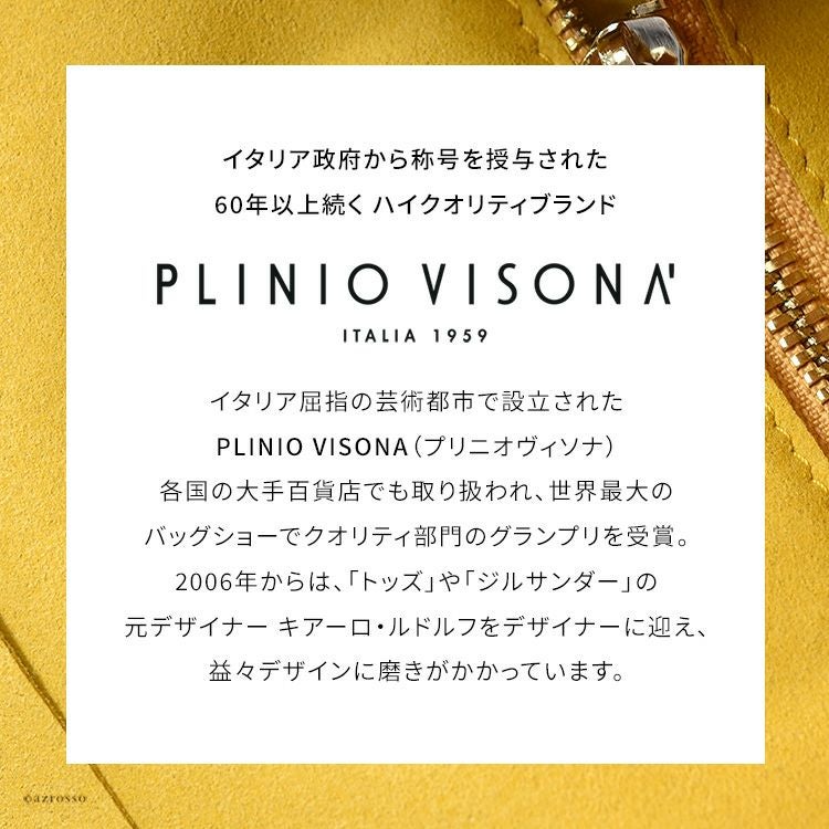 PLINIO VISONA(プリニオ ヴィソナ/プリニオ ビソナ)は1959年創業のイタリアバッグブランド。1966年にイタリア政府大統領から「カヴァリエレ・デル・ラヴォロ」の称号を授与されたことに始まり、2009年には、世界最大のバッグショーでクオリティ部門のグランプリを受賞するなど現在に至るまで数々の栄誉を持っています。