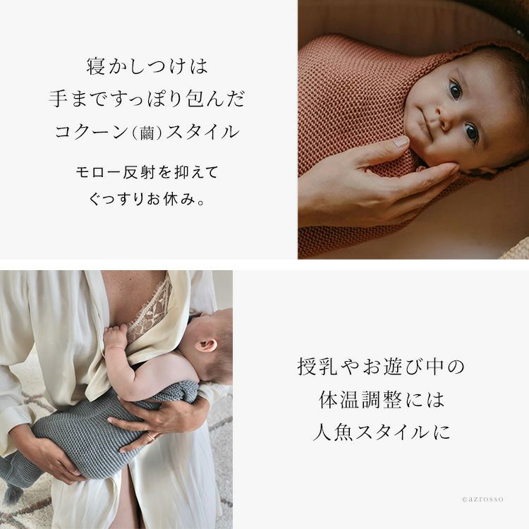 一枚布タイプもありますが、毎回上手く巻くのは大変。妊娠中からお母さんと子どもを繋ぐおしゃれなベビー用品で人気のフランスブランド ILADO:イラド のスワドルは筒型のニット素材。手まですっぽり包んだコクーン(繭)スタイルはもちろん、授乳中やお出かけ・遊ぶときには手が出せるマーメイド(人魚)スタイルで体温調整にとお昼寝や寝かしつけ以外にも使えます。
