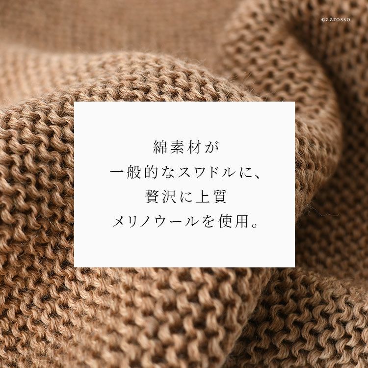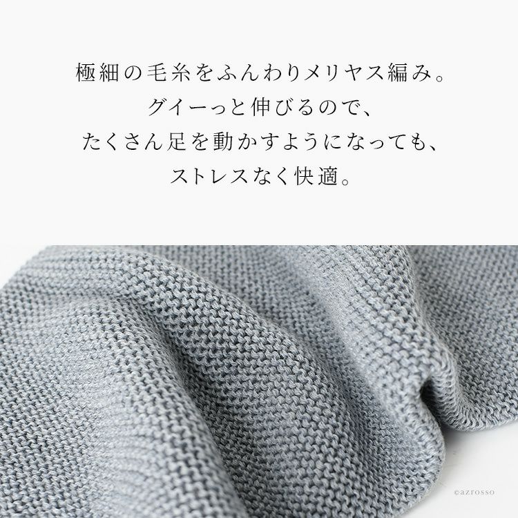 ウール=ちくちく と連想する方もいるかもしれませんが、メリノは高級肌着や靴下によく使われる非常に細やかな繊維で、しっとりとツヤ感ある滑らかな肌触り。