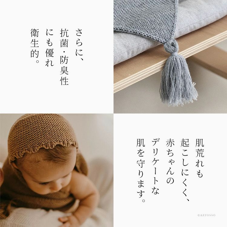 吸湿性・保温性に優れているので冬温かく夏はサラッと涼しい機能的な天然素材。秋冬はもちろん、春夏も通年を通して1年中使用できます。さらに抗菌・防臭性も兼ね備えていて衛生的。感想や肌荒れが気になる赤ちゃんのデリケートな肌でも安心して使用できます。