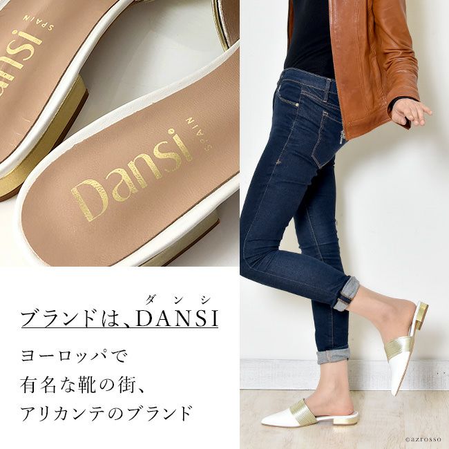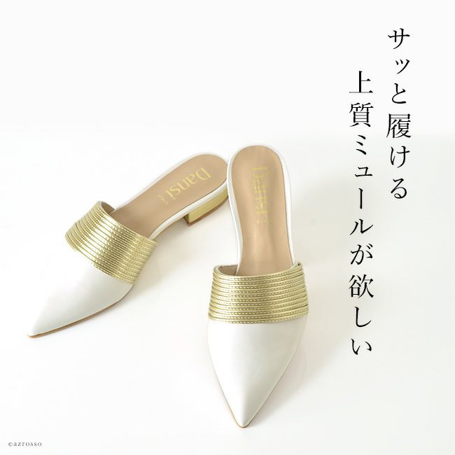 ミュール サンダル レザー フラット シューズ 本革 DANSI レディース ぺたんこ 靴 とんがり つっかけ ポインテッド 白 ホワイト ゴールド
