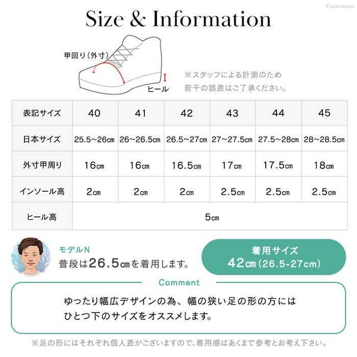 コメント:ゆったり幅広デザインの為、幅の狭い足の形の方にはひとつ下のサイズをオススメします。