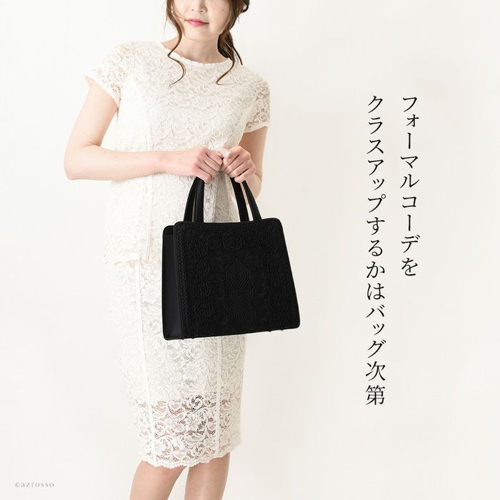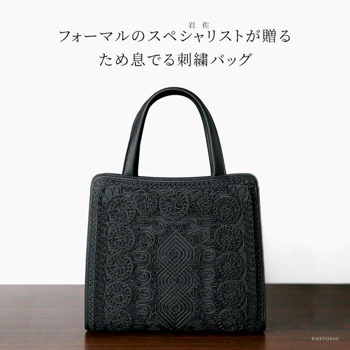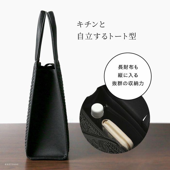 ▼特徴:ブラックフォーマルバッグ|底鋲付き|自立|軽量|軽い|コード刺繍|トート型|大きめ|大容量|スクエア|撥水|撥油|抗菌|防カビ|喪服に会うバッグ