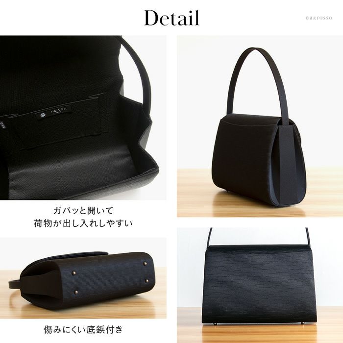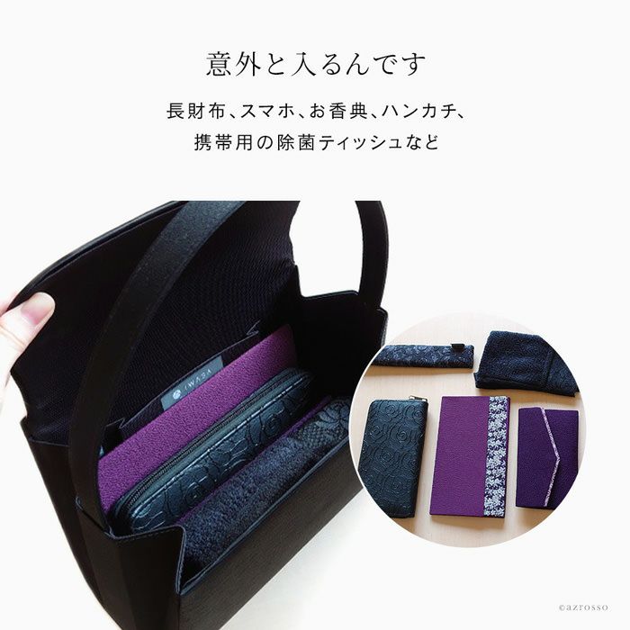ジャバラ部分が大きく開き、数珠、香典袋、傘、扇子、ハンカチ、長財布等々…フォーマルシーンに必要な荷物をしっかり収納します。