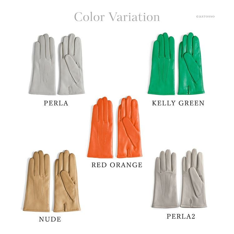 商品画像9 商品画像10 カラーバリエーション 寸法画像 手袋サイズガイド レディース・革 着用感画像 モデル画像 PERLA モデル画像 KELLY GREEN モデル画像 RED ORANGE モデル画像 NUDE モデル画像 PERLA2 共通ラッピング画像